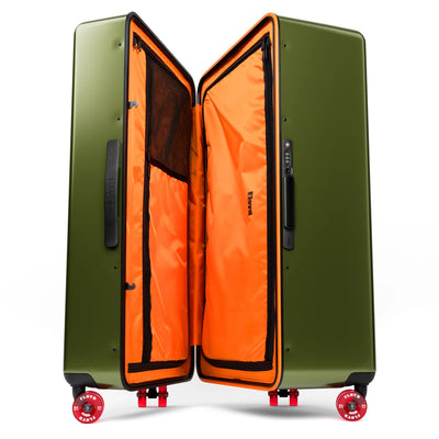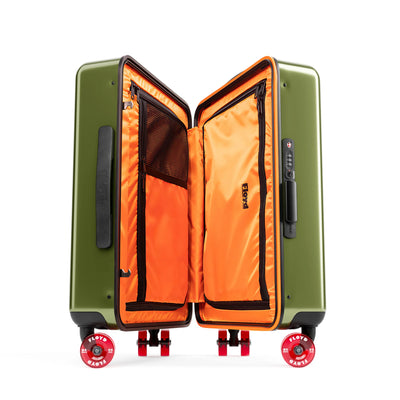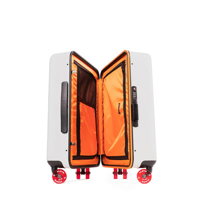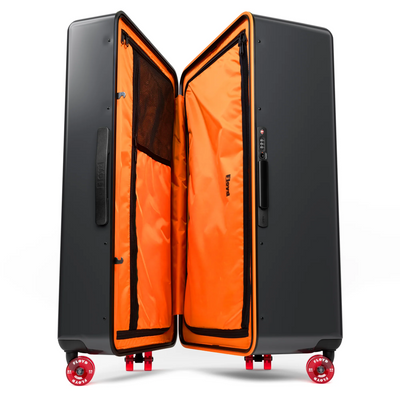 Der Floyd Check-In ist der beste Reisebegleiter, den man sich wünschen kann. Er kann nicht nur viel aufnehmen, sondern auch noch mehr einpacken. Ersteres liegt an der extrem robusten Außenschale, letzteres an den geräumigen Innenfächern. Und dass Dein Floyd-Koffer den Geist der kalifornischen 70er Jahre atmet, erkennst Du sowohl an seinem auffälligen orangefarbenen Innenleben als auch an den einzigartigen Skateboard-Rollen.